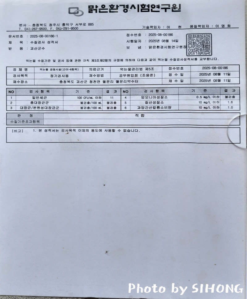 그런데 지난 5월2일 시험성적서에 따르면 물은 약알칼리로 pH 7.6, 우라늄 0.0003 mg, 질소가 1.5 mg, 염소가 1.2 mg 이라고 되어있다. 물론 기준치 이하의 수치라지만 이 물을 먹어야 하나하는 의구심이 생긴다.